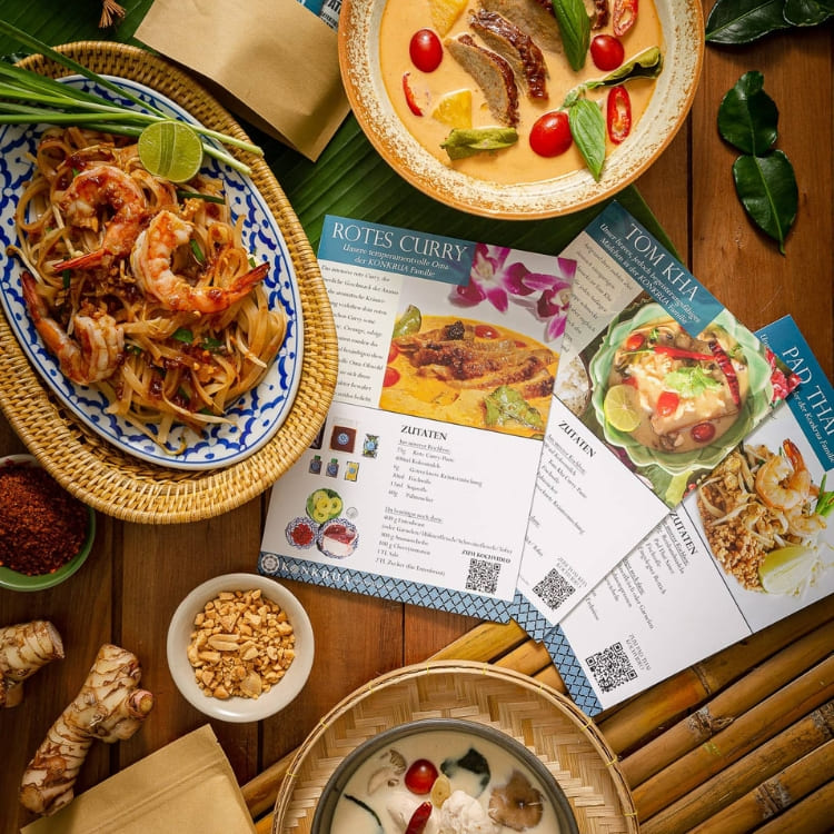 Die Kochboxen reichen für 3-4 Portionen. Dank unserer mit viel Liebe gestalteten Rezeptkarten brauchst Du nur 30 Minuten, um ein Stück Urlaub und den echten Geschmack Thailands auf Deinen Tisch zu zaubern.